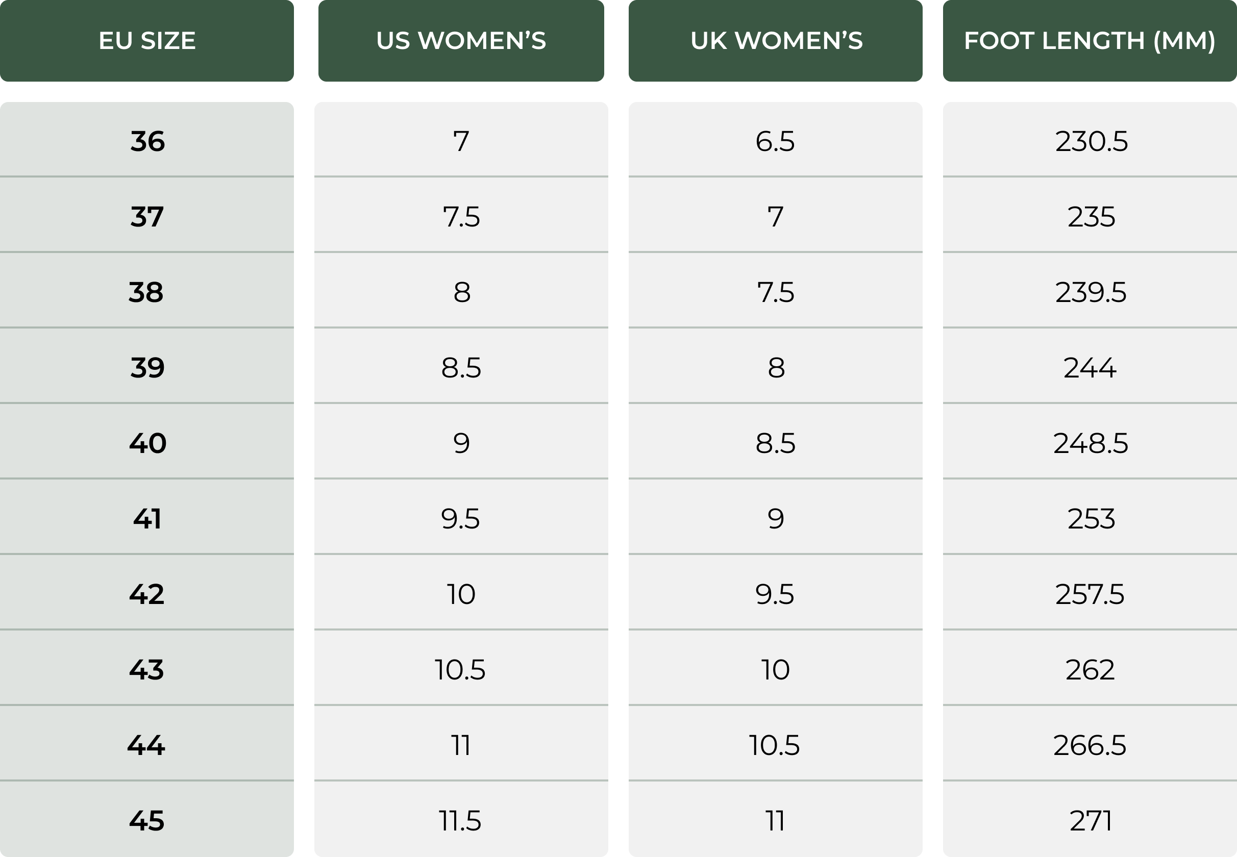 Down To Ground® Shoes are made using a single universal EU sizing system. All US and UK Men’s/Women’s sizes shown here are accurate conversions from the EU root size. Please use this guide to select your correct equivalent size. Shoes fit true to size.